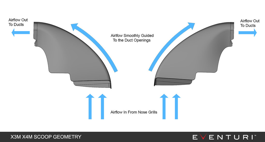 The X3M/X4M intake setup from BMW although awkard at first sight, is a very well designed system in the given space available. The flow path from the filters to the turbo inlets is very direct and does not change direction as abruptly as the usual OEM airbox designs. So instead of a complete redesign we focused on improving the OEM airbox with less restrictive flow and improved temperature efficiency. We have developed replacement drop in filters made from non-woven mesh which have a much higher flow rate as compared to the stock paper filters. To help reduce inlet air temperatures and force air into the airbox we designed large front scoops which sit behind the grills. The carbon scoops channel air into the ducts and effectively effectively de-restrict the inlet side of the airbox. The final piece is the carbon airbox lid which although doesn’t add to the performance, it does allow for a more audible induction sound and gives the engine bay a much needed aesthetic improvement.